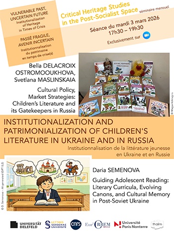 Nous aurons le plaisir d’écouter (en anglais), puis de discuter (en anglais, français, ou autre) les communications suivantes : — Bella DELACROIX OSTROMOOUKHOVA (Sorbonne Université), Svetlana MASLINSKAIA (Université Grenoble Alpes), Cultural Policy, Market Strategies: Children’s Literature and its Gatekeepers in Russia Soviet children's literature was very diverse and prolific, yet only a few authors and works are […] |